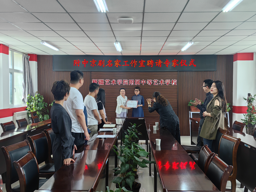 为推动新艺附中优质校建设项目——京剧名家工作室的组织实施,5月17日上午,京剧名家工作室特聘专家仪式在附中举行。附中党委副书记、校长古丽扎尔·沙帕尔、新疆京剧团(乌鲁木齐)国家一级演员陈瑛及其团队、附中相关部门负责人参加会议。