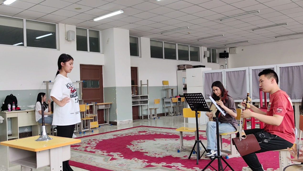 5月17日,戏曲教学部围绕毕业戏、基础课课程汇报、京剧器乐课程汇报进行了排练。上午,教学部全体师生齐聚2001教室,由新疆京剧团一级演员、附中特聘专家陈瑛老师指导说戏《红鬃烈马》,2019级学生参加排练,2020级、2022级学生进行观摩。下午,京剧器乐专业课程汇报排练在1411教室开展,排练由王佳老师带领2020、2019级学生共同进行,排练剧目《赵氏孤儿》《霸王别姬》《贵妃醉酒》《空城计》《钓金龟》。同时,在2001教室迪丽努尔老师和王鼎老师带领全体学生进行基本功课、武功课课程汇报的编创和排练。