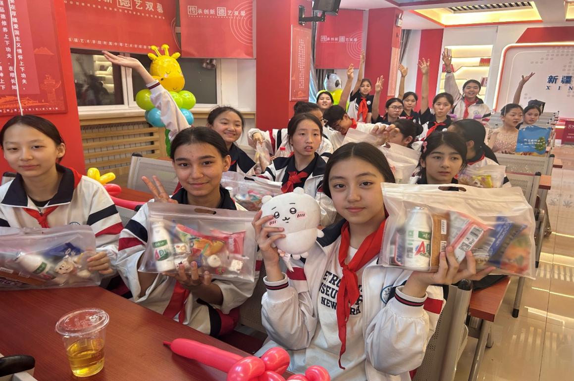 两校学生还互相邮寄了各自本地特产零食和纪念品,附中学生在表演间隙与主持人一同为深圳艺术学校的同学们介绍了哈密瓜、玛仁糖、牛肉干、馕等来自新疆小朋友们送上的礼物。最后,活动在两校同学合唱《中国共产主义少年先锋队队歌》的歌声中落下帷幕。